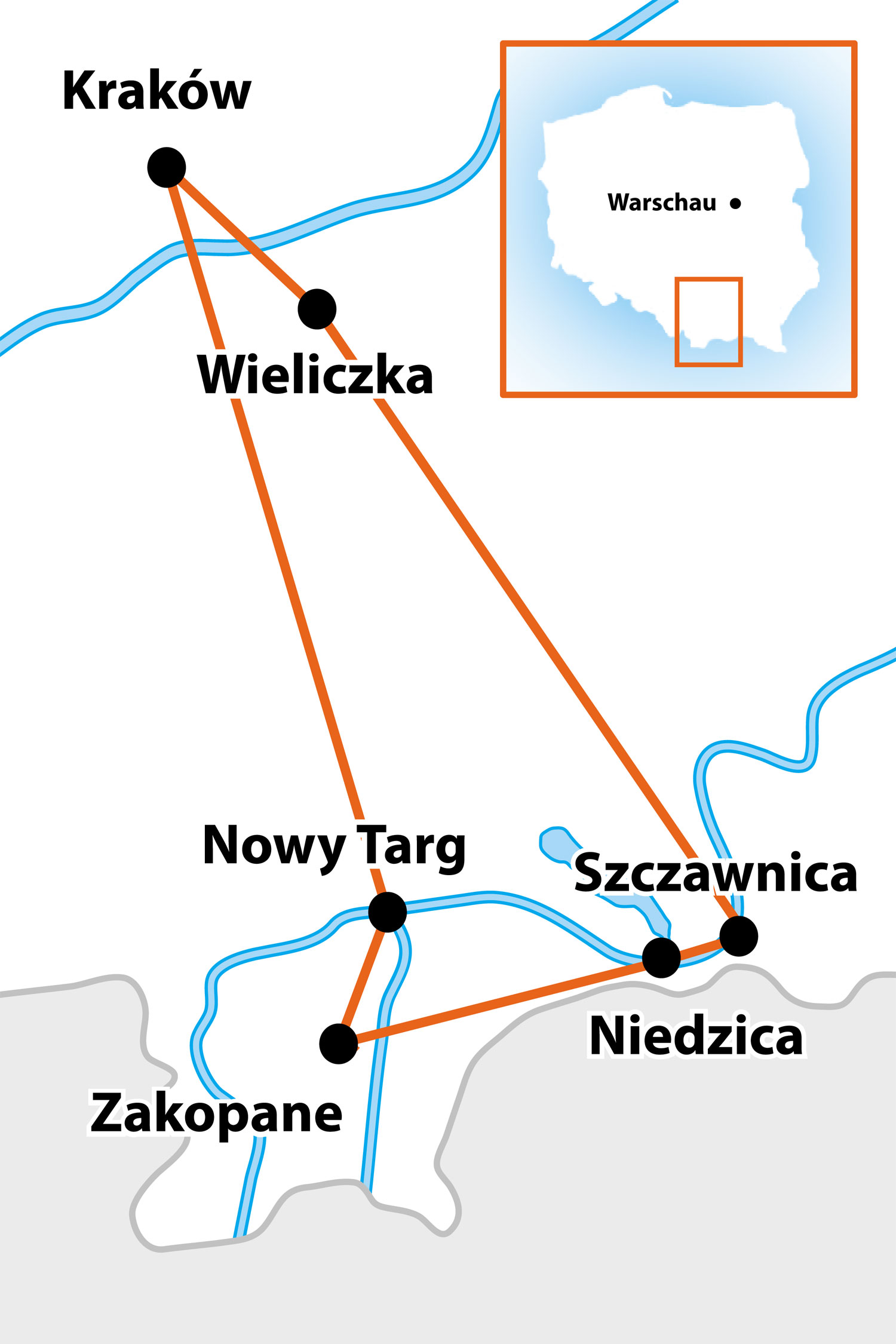 Wir bieten in Südpolen eine schöne Radwandertour an. Ausgangspunkt ist Krakau. Sie fahren durch Teile der Tatra zum Pieniny Gebirge (an der Grenze zu Slowakei) und zurück über das bekannte Salzbergwerk Wieliczka wieder nach Krakau.